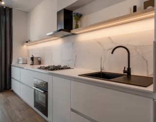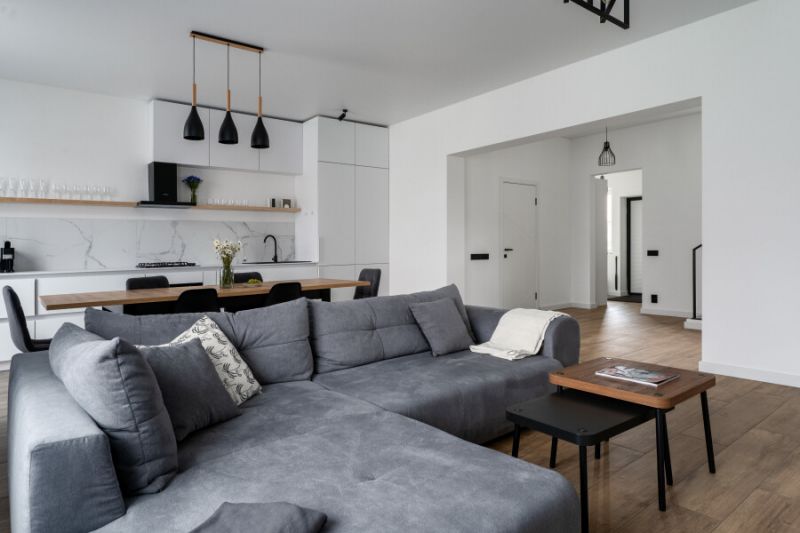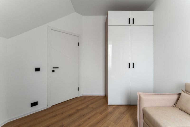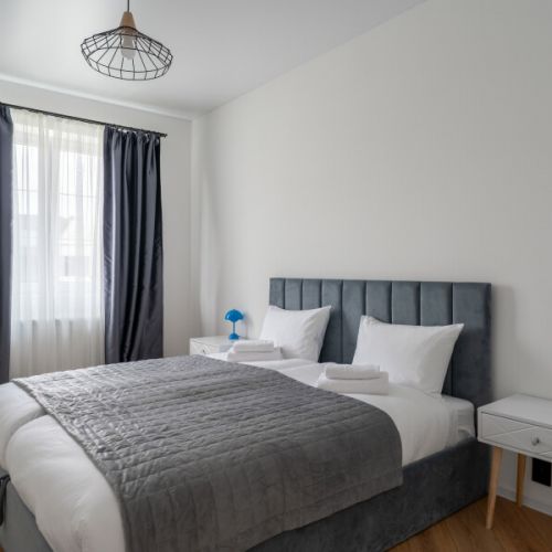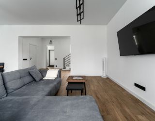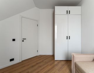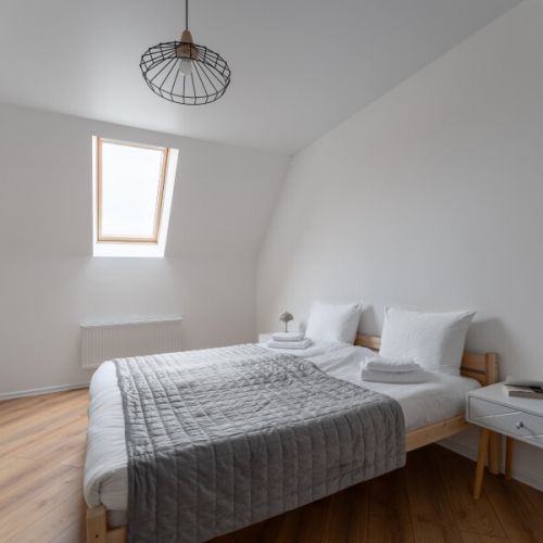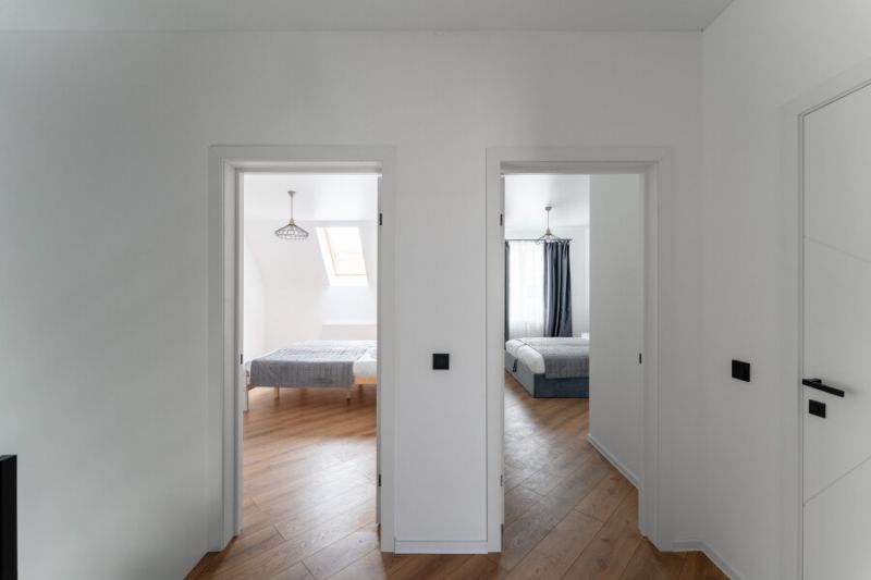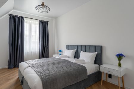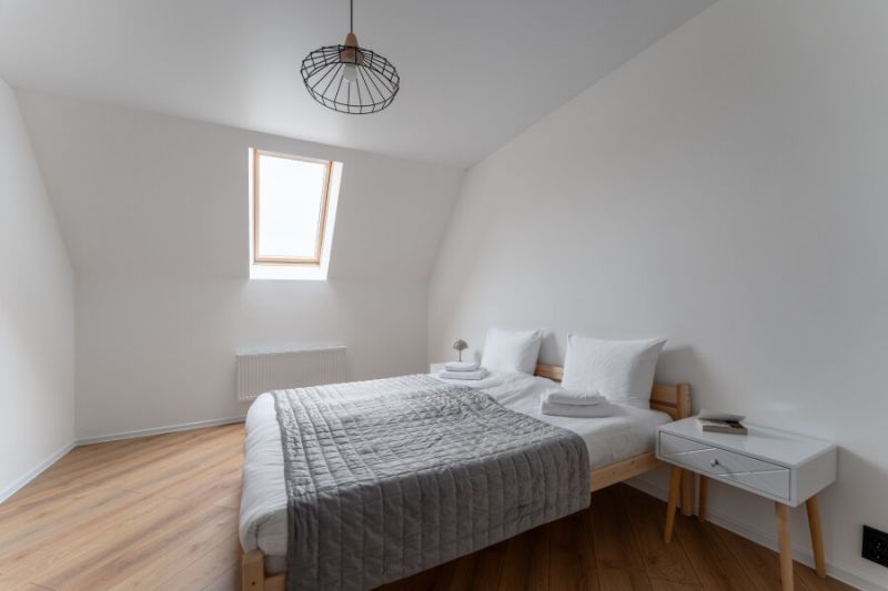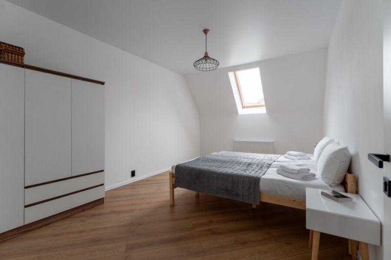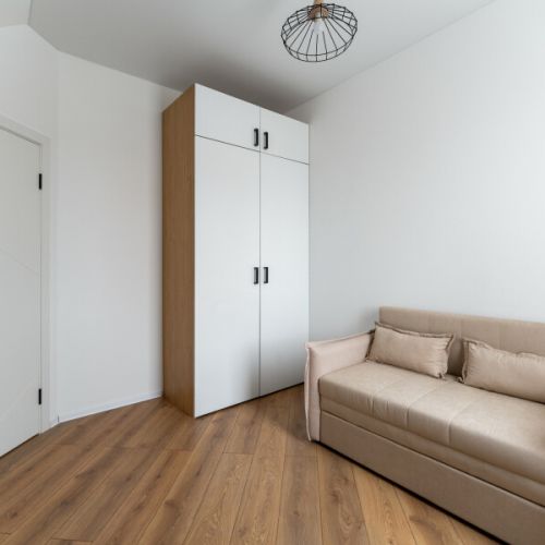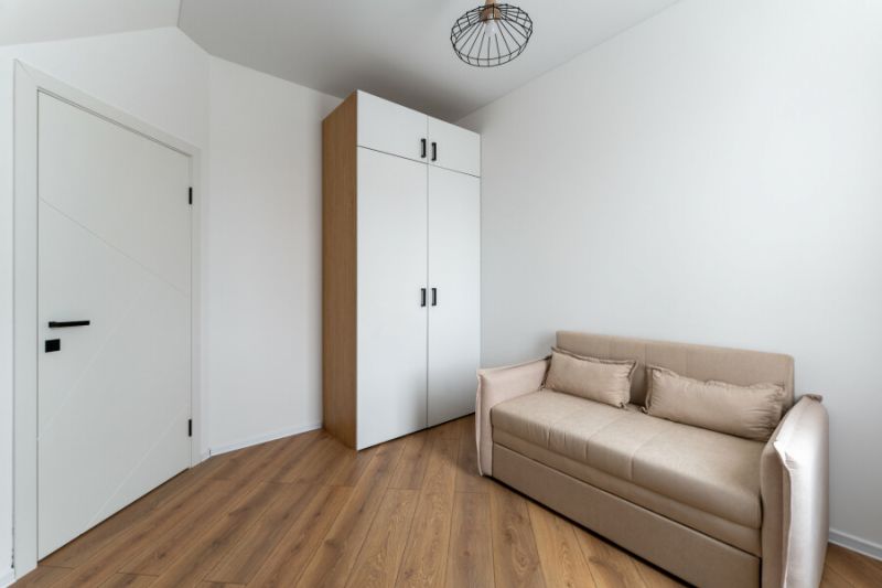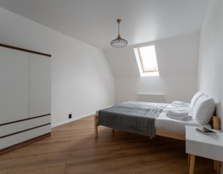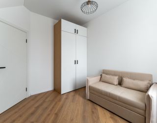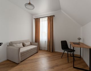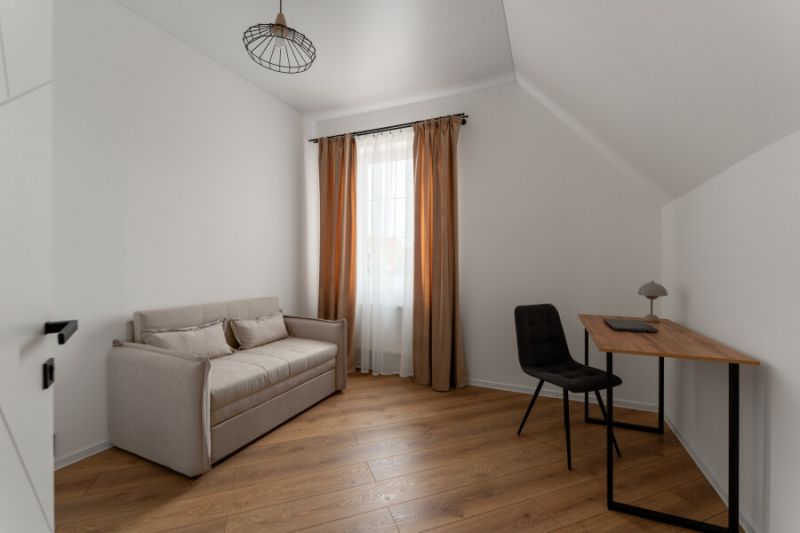 На первом уровне расположены: просторная кухня-гостиная, объединяющая зону для приготовления пищи, обеденную область и место для отдыха с диваном; удобный санузел; прямой выход на прилегающую к дому зеленую территорию. На втором уровне находятся: две отдельные спальни с большими двуспальными кроватями; кабинет, оборудованный односпальным диваном; дополнительный санузел.